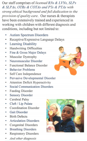 Our staff comprises of licensed RNs & LVNs, SLPs & SLPAs, OTRs & COTAs and PTs & PTAs with strong ethical background and full dedication to the provision of quality care. Our nurses & therapists have been extensively trained and experienced in working with children with different diagnosis and conditions, including but not limited to: